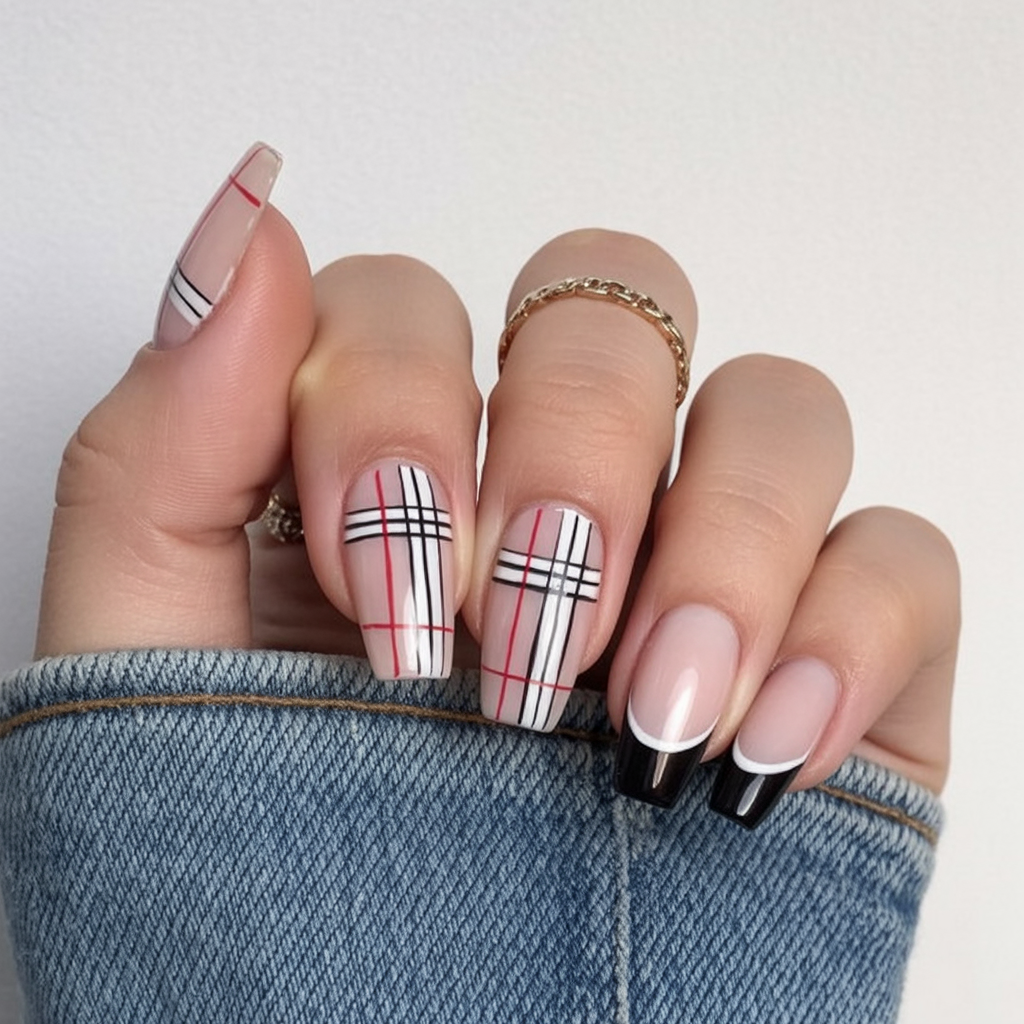 Bold yet timeless, this set plays with plaid in a structured, modern way. The black and white base with sharp red accents gives it that refined Burberry-inspired flair, while the French tip twist adds personality. It’s like your favorite trench coat—but in nail form.