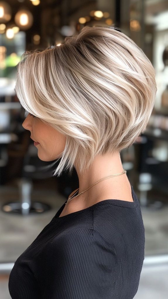 This layered blonde bob is the epitome of elegance with its voluminous layers and precision-cut ends. Perfect for women over 40 seeking new looks, the style adds depth and dimension to fine hair. The subtle graduation at the back creates an effortless lift, ideal for framing a round face or highlighting a strong jawline.