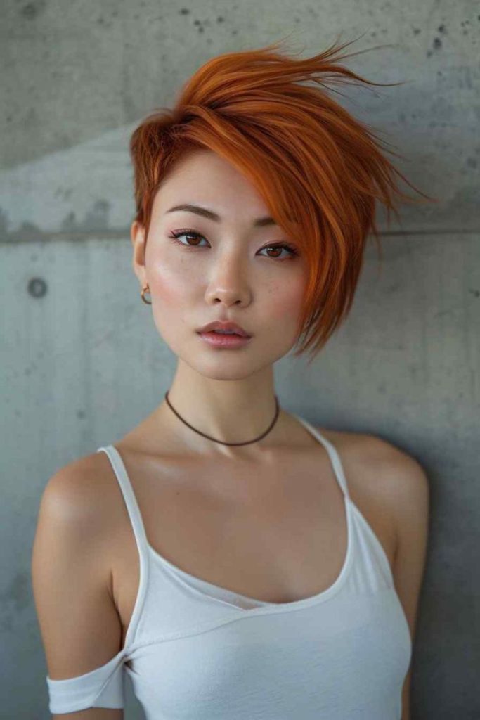 The asymmetrical copper pixie is a vibrant and bold hairstyle for women who want to stand out. The copper tones enhance the hair’s natural warmth, while the asymmetrical cut adds an edgy touch. This look is perfect for women embracing Japanese or Korean trends.