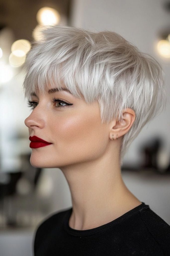The icy blonde pixie with classic bangs is a timeless yet modern choice for 2025. The crisp color adds a cool, contemporary vibe, while the soft fringe frames the face perfectly for women with round faces or high cheekbones. This cut suits both formal and casual settings, offering versatility and charm.