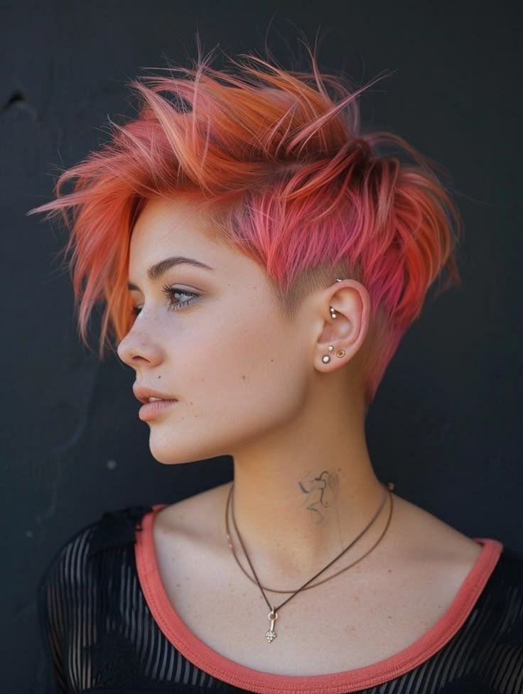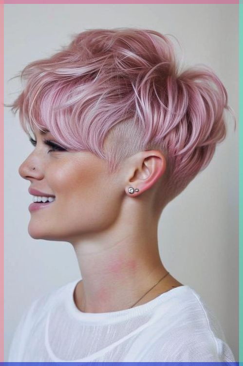 This messy pink pixie combines playful color with a daring edge. The shaved sides add contrast to the textured top, creating a unique silhouette that’s perfect for bold and confident women. The soft pink hue is ideal for fine hair, adding a fun, light-hearted vibe.