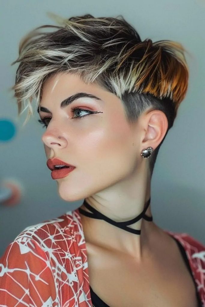 This layered blonde pixie with dark roots blends boldness and sophistication. The layers add movement and depth, making it ideal for thick hair, while the contrast between the blonde and dark roots creates an edgy vibe. The asymmetric fringe flatters angular and heart-shaped faces.