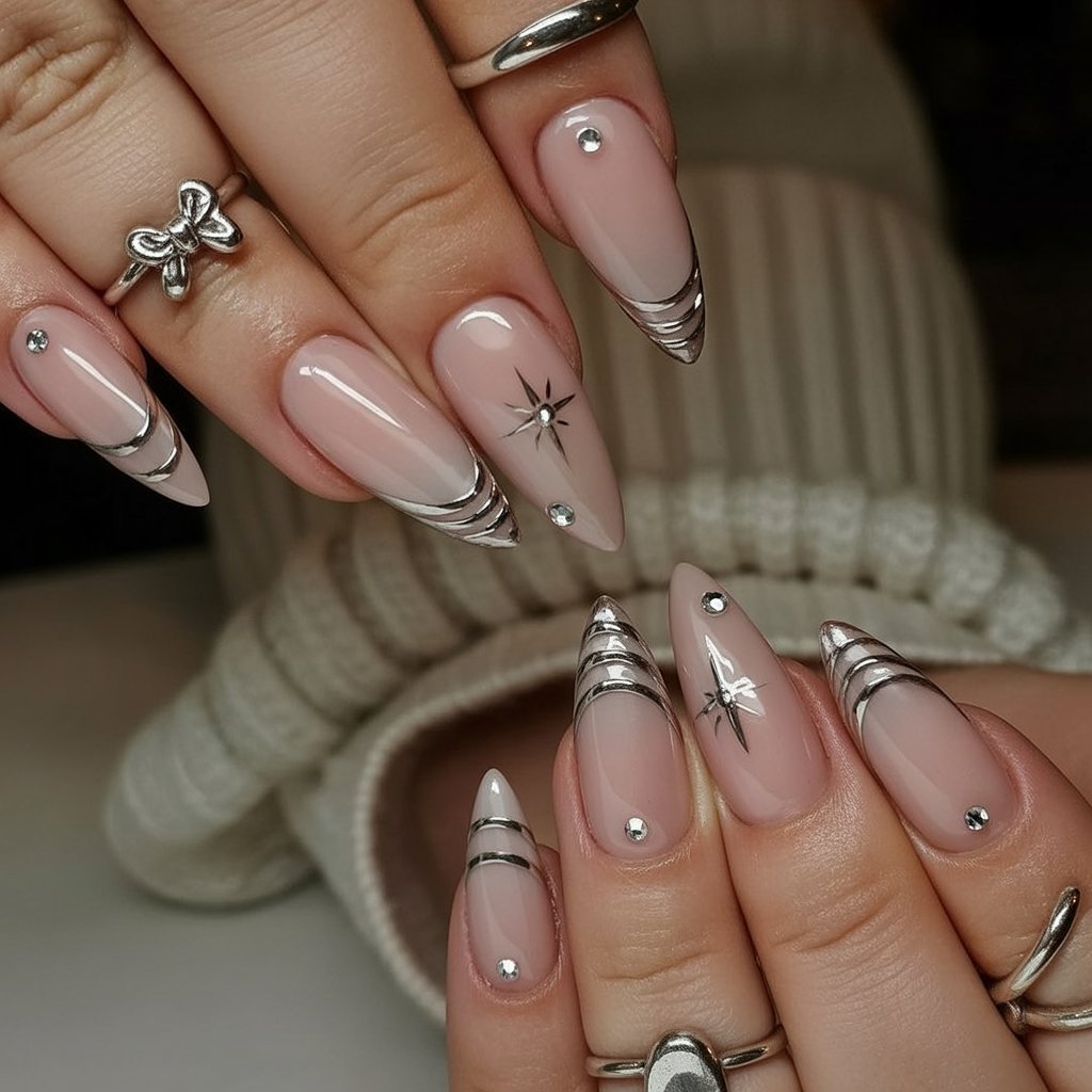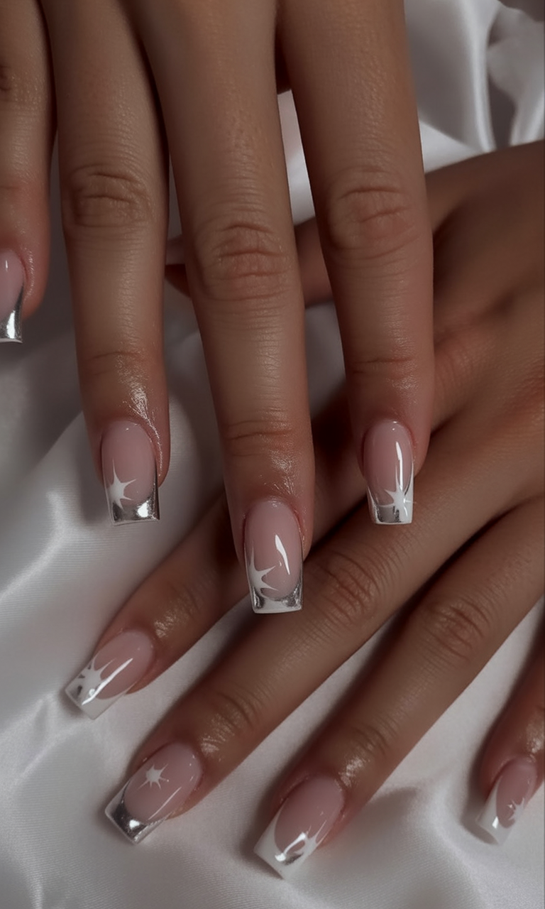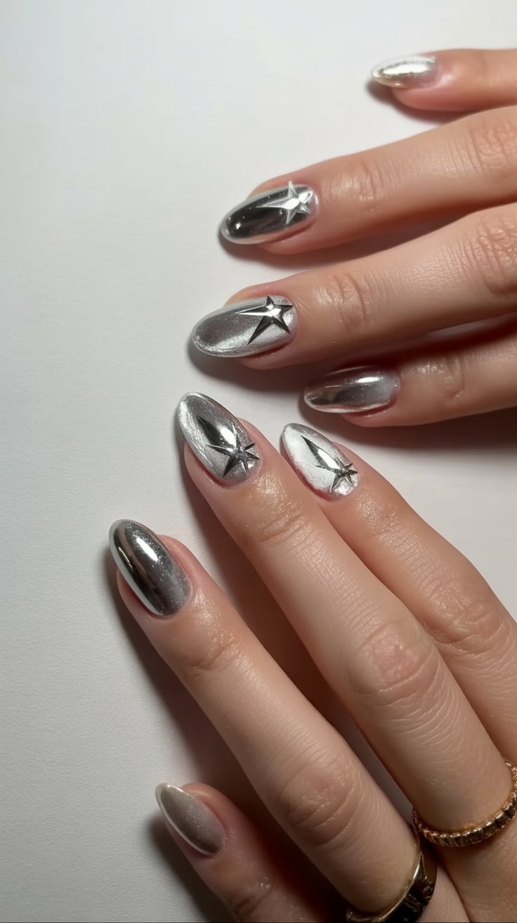 Say you have always found yourself longing to have your nails resembling the night sky well then these silver star patterns will come to your rescue. A mirror-like effect is made by the smooth chrome base and the embossed details of the star add a playful, even cosmic feel. It is a trendy, fun and slightly magical look.