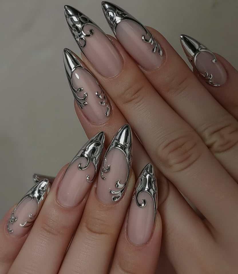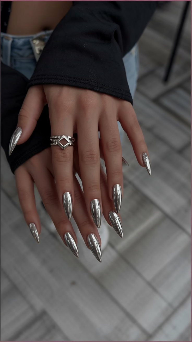 The look of silver chrome nails is so striking that it seems like the future and at the same time a classic. The almond form is combined with a smoothly polished metallic finish forming a bold but not too over-the-top aesthetic. It is an expression that shows that you are sure enough to shine in the sense you are aware of the strength of being subtle and elegant.