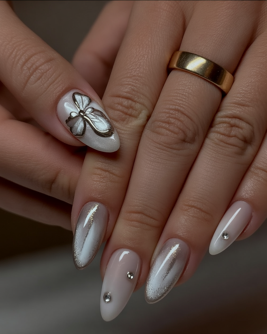 These are romantic and feminine silver bow nail which is pure elegance with a playful touch. The soft gradient polish shines with a touch of glimmer and the tiny bow detail adds a touch of panache that makes this design ideal at prom, weddings, or any other special occasion. It is fashionable and at the same time funky as a mini gadget developed into your nails.