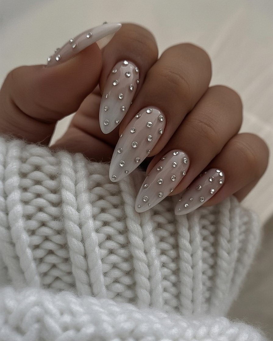 Flirtatious and with a touch of rebellion, these studded silver nails provide a look and feel to a classic appearance. These small straight lines of gems reflect light in the prettiest way and this composition creates the effect of glossiness but, at the same time, of minimal chic as well.