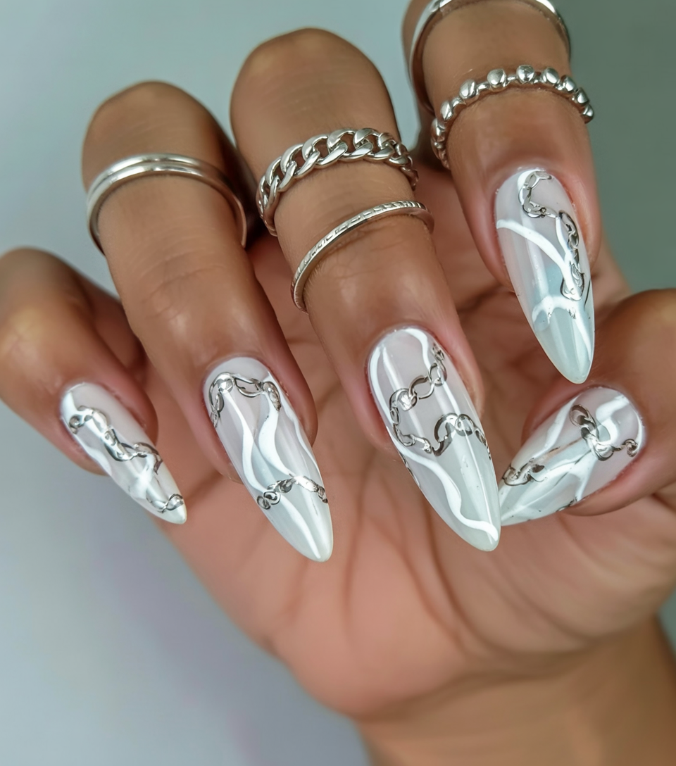 These nails are sharp with silver chain grip highlights placed over a white and metallic foundation. They are sharp but cool, the type of manicure that works well when you want to combine rough and feminine energies. Its design resembles small jewelry items in your nails- stylish and not afraid of being over the line.