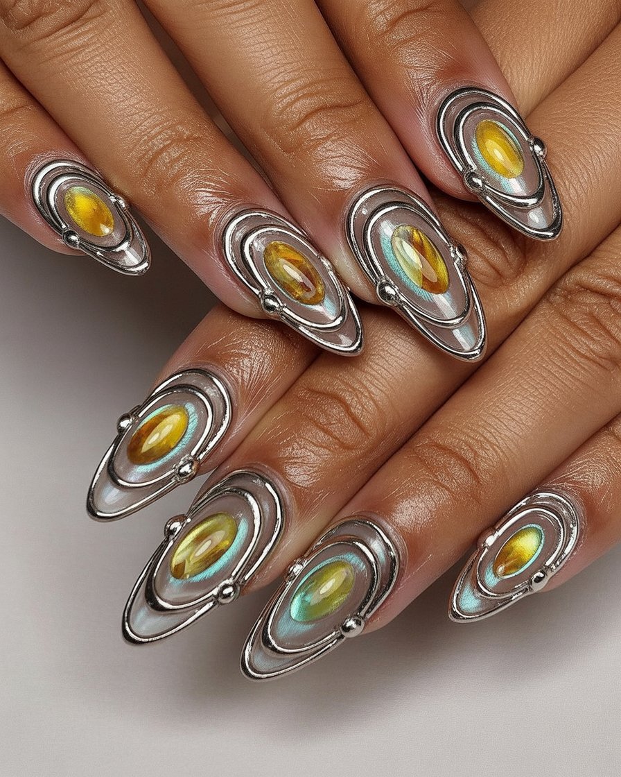 Cool, dystopian and unashamedly original, these silver nails with 3D centers in the shape of a jewel appear as something that can be worn. They are theatrical, glam and the type of set that you would see on a runway or in a glossy editorial spread.