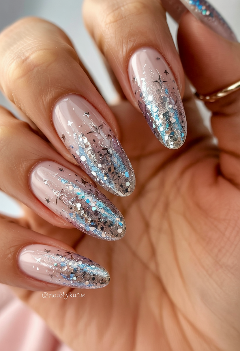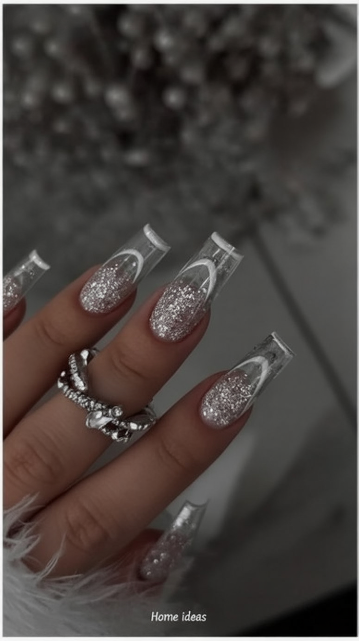 These glittering gradient nails are playful, yet classy, with silver glitter with a slight tint of blue to give it a frosty and festal look. They are light and playful, as small fireworks in your fingertips. An ideal option in case you desire a manicure that will leave you smiling each time you look down at your hands.