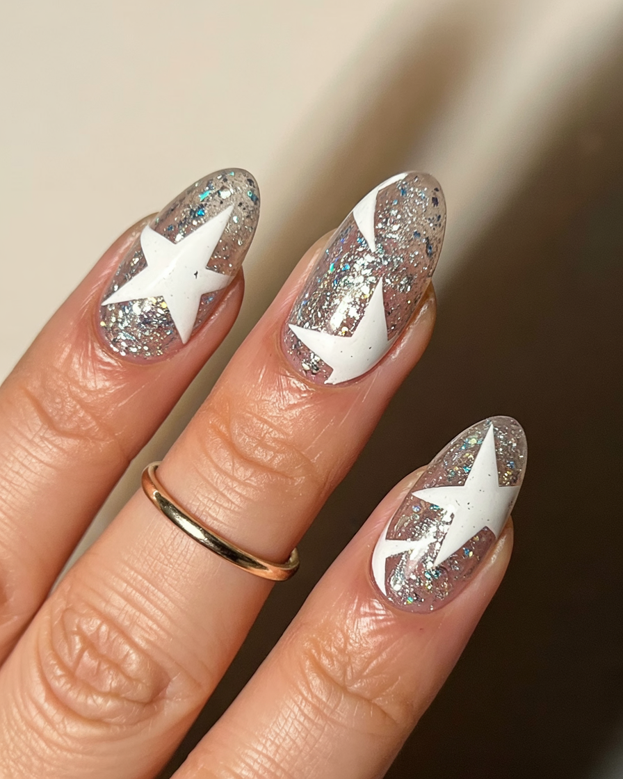 These nails are fun and festive with big glitter polish and big white stars in them. Like the night sky, they glitter and they reflect the light in the most beautiful manner. It is a style that is both fun and fancy that is best suited when you feel like having your nails in the spotlight.
