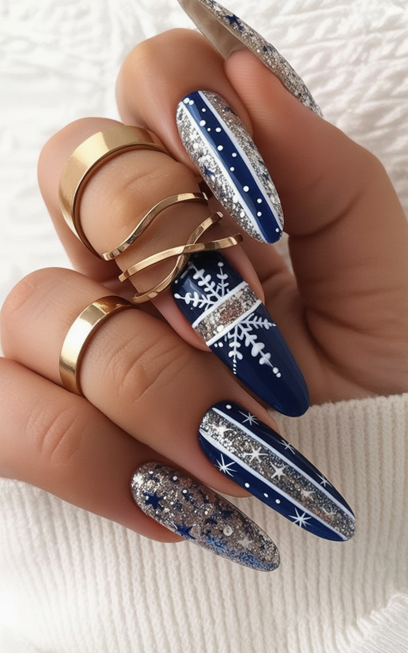 Never has winter chic looked this good. The bold navy polish topped with silver glitter, snowflakes, and stripes give the festive warm feel. These nails are slightly jingy, slightly theatrical and all just great holiday season nails.