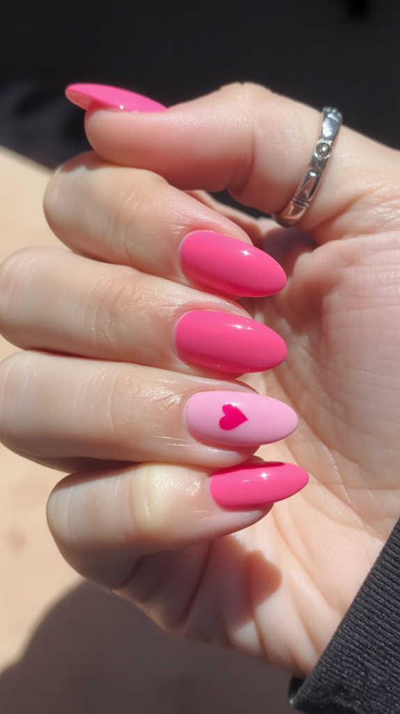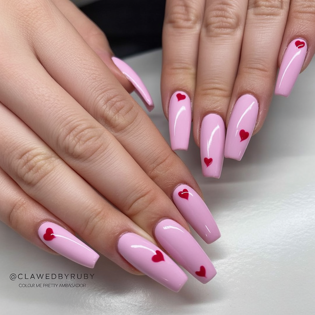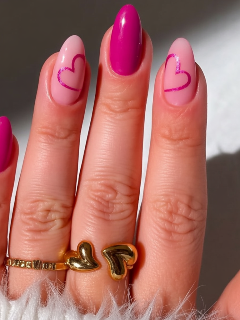 Styling notes: keep the almond shape slightly slanted so the heartline will appear with a clear and balanced look. Request a sheer neutral base, and ask your tech to map out those heart curves first (with a thin outline) with pink, then fill in and top with high-gloss so the lines look sharp. While you’re doing this at home, use a fine liner brush and build your heart slowly—small heart nail art is all about patience. Simple Valentine’s Nail 2026… beautiful and easy, which simple Valentine’s nails are cute nail polish with designs.