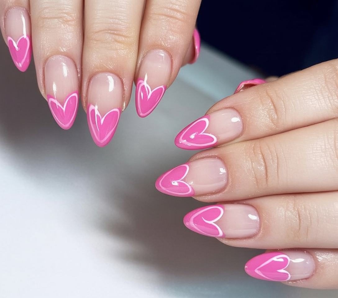21. Pink Heart French Tips on Almond Shape