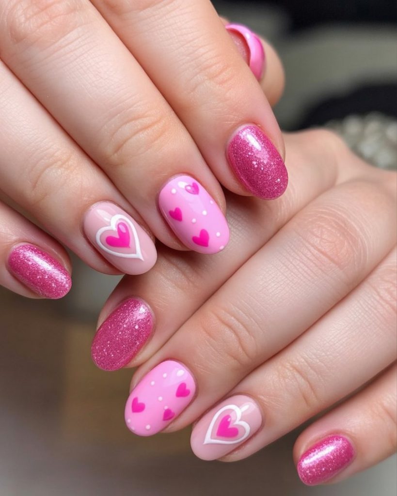 All right, this one is for the girl who needs a little sparkle therapy. Shimmery pink nails feel festive, and the soft heart accents add a playful “I can still have fun” touch. It’s bouncy and flirtatious and frankly just cheers your mood every time your hands catch the light.