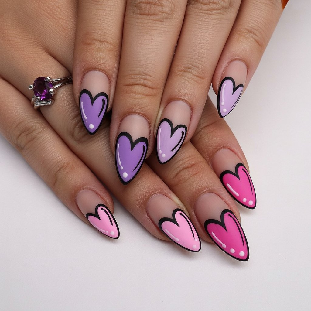 This one’s got some moxie to her, and I mean that only as a compliment. The heart-tipped design is like a graphic liner moment for your nails, especially with that black outline. The combination of pink and lavender hues keeps it fun and artsy, but the clean lines ensure that it feels deliberate, not overdone. It’s giving “I am romantic, but I have boundaries.”