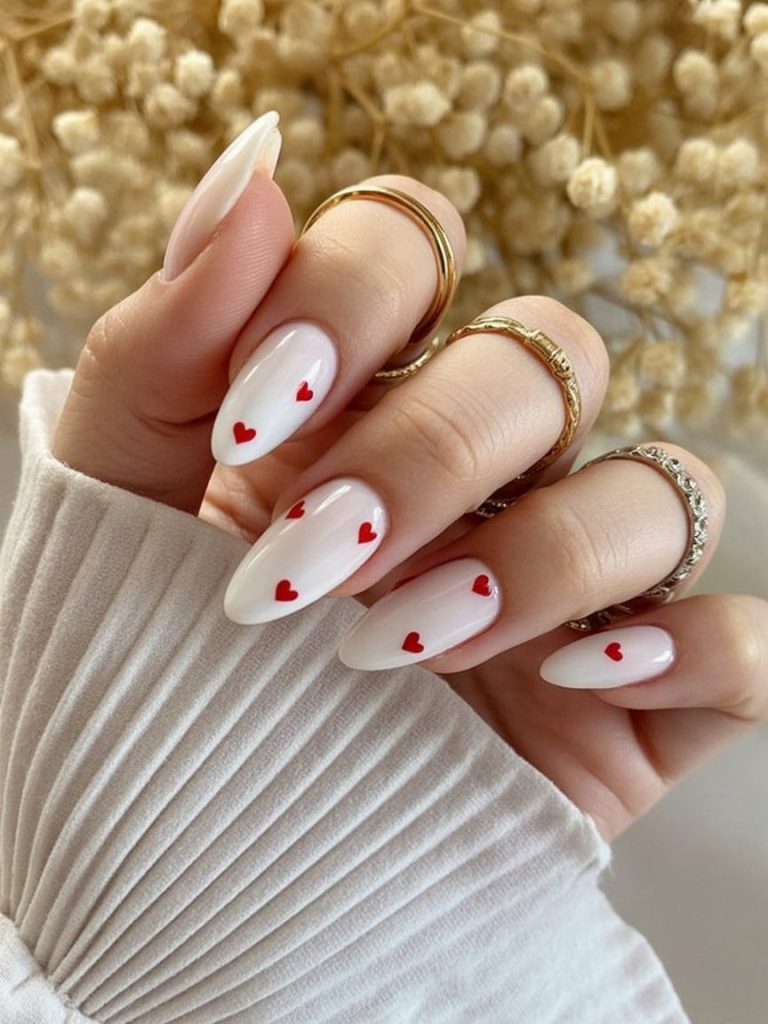 Who it’s for: anyone who wants simple Valentine’s nails in 2026 that still feel polished. The almond shape is especially flattering if you want your fingers to look longer, and the milky, neutral tone works on basically every skin tone. Keep the hearts spaced out for a minimalist holiday nail vibe, and ask for a glossy top coat so the design stays crisp. This is also great if you usually wear solid-color nails but want a cute twist without going full glitter.