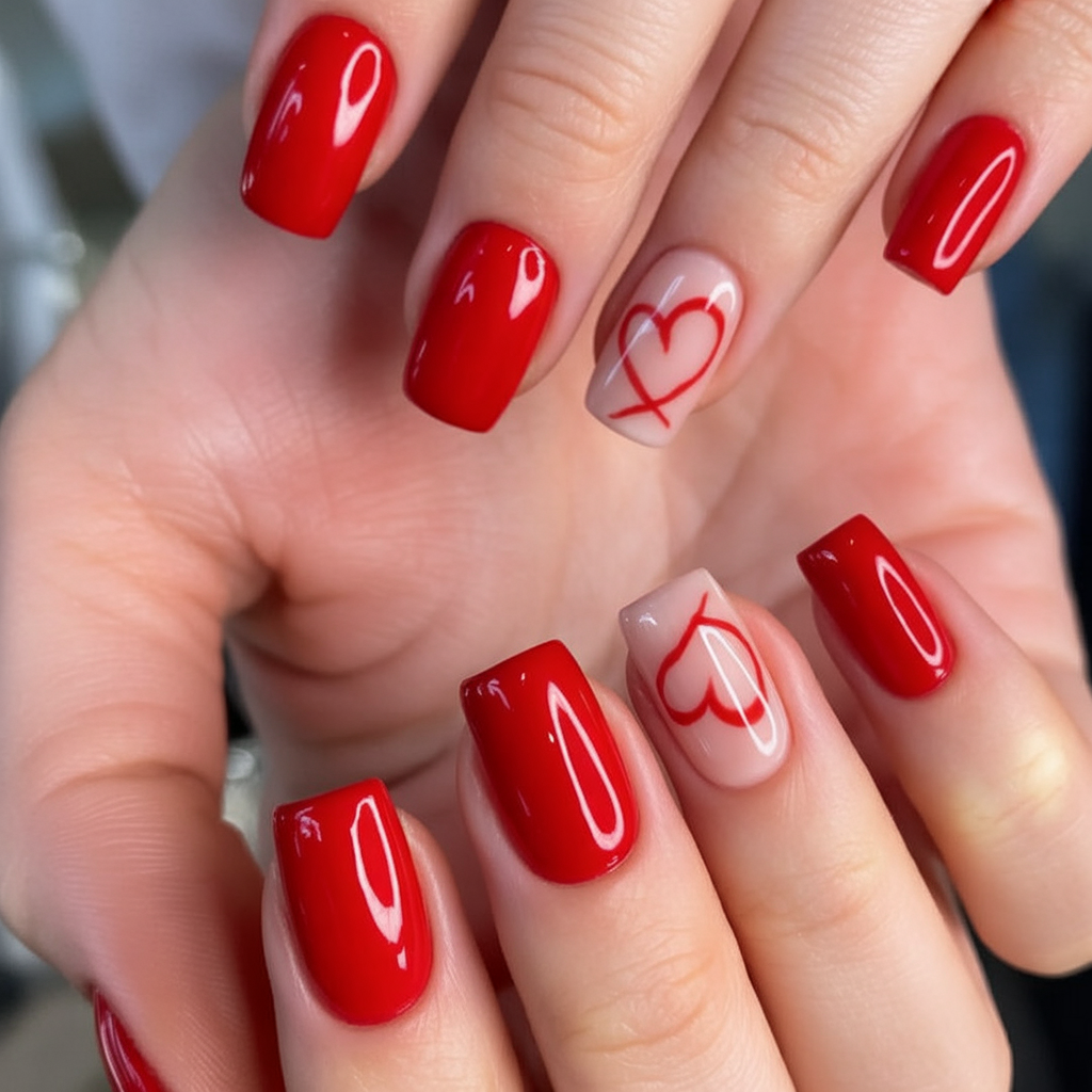 If you keep committing pinspiration to memory but never booking an appointment, let this be your sign. Short red in a short square is flattering, wearable, and doesn’t require overly much work to maintain. Keep the accent nails sheer and simple so that the heart outline is sharp and contemporary. It’s the easy type of Valentine’s Day 2026 look that is great for dinner plans, office days, and anything in between.