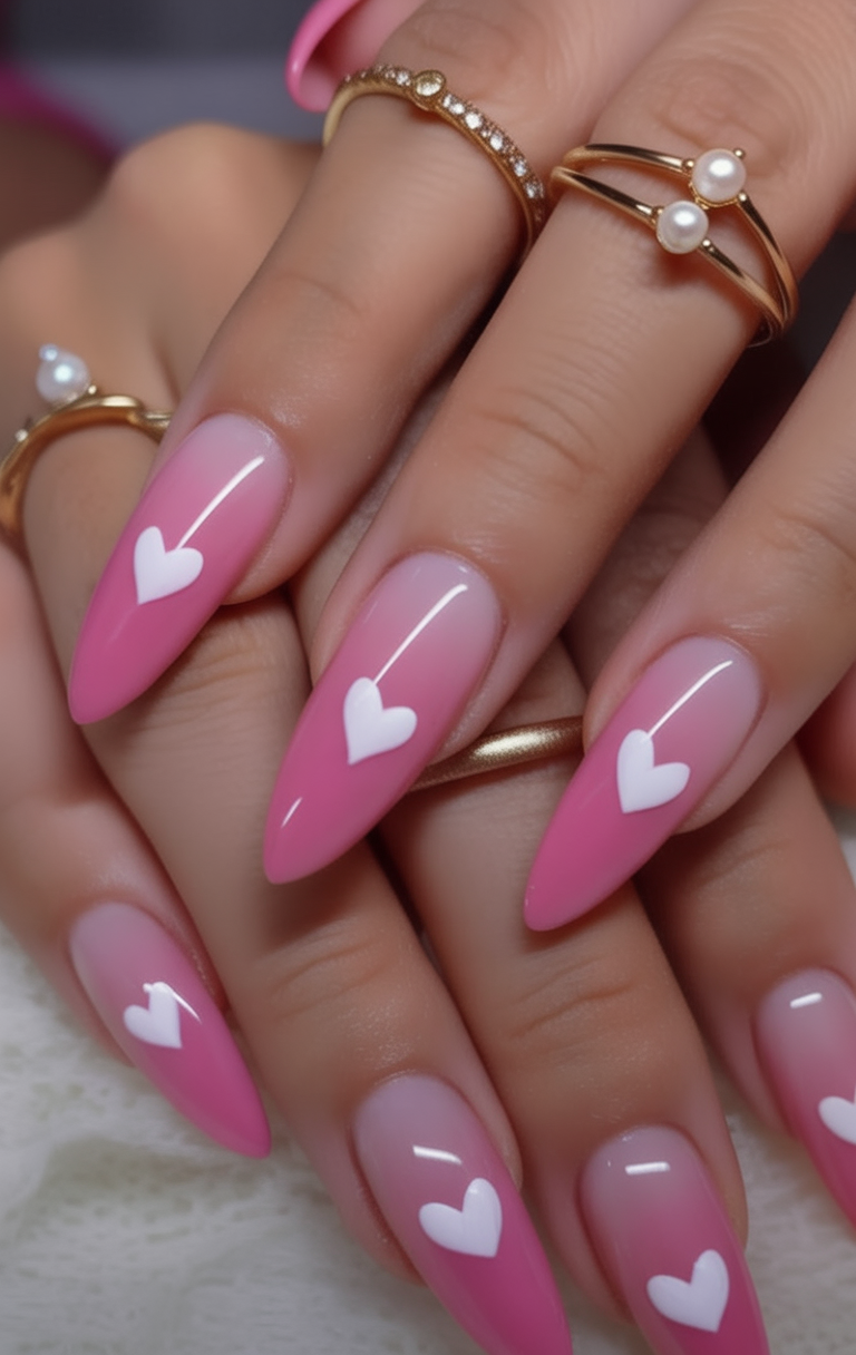 13. Almond Pink Ombre With White Hearts