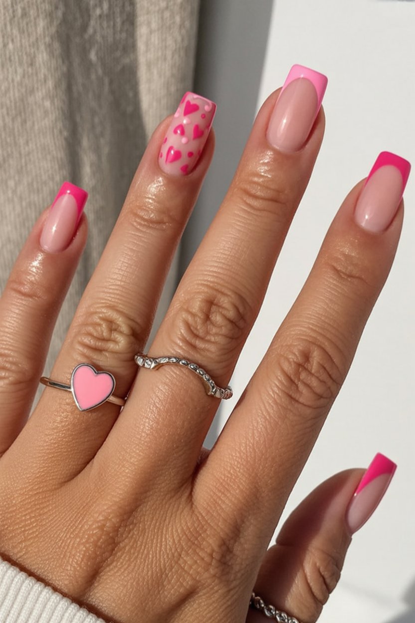 This is the manicure equivalent of a bright lipstick—an instant mood lift. The pink French edges feel fresh and modern, and that little heart moment on the accent nail makes it Valentine-ready without turning it into a whole theme. It’s flirty, clean, and honestly kind of empowering in a “yes, I’m fun” way.