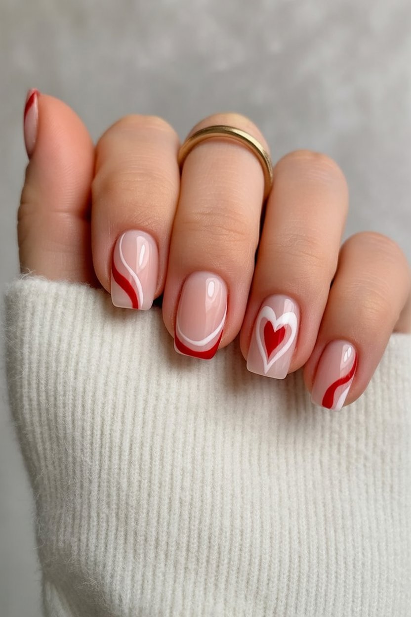This is what happens when classic gets a little flirt. The clean, sheer base means that everything feels fresh and “expensive”; those red swirls are what’s giving you all that playful Valentine energy without the feel of a theme. And that one heart accent? It’s the cherry on top—understated enough for a workweek, fun enough for a weekend date night.