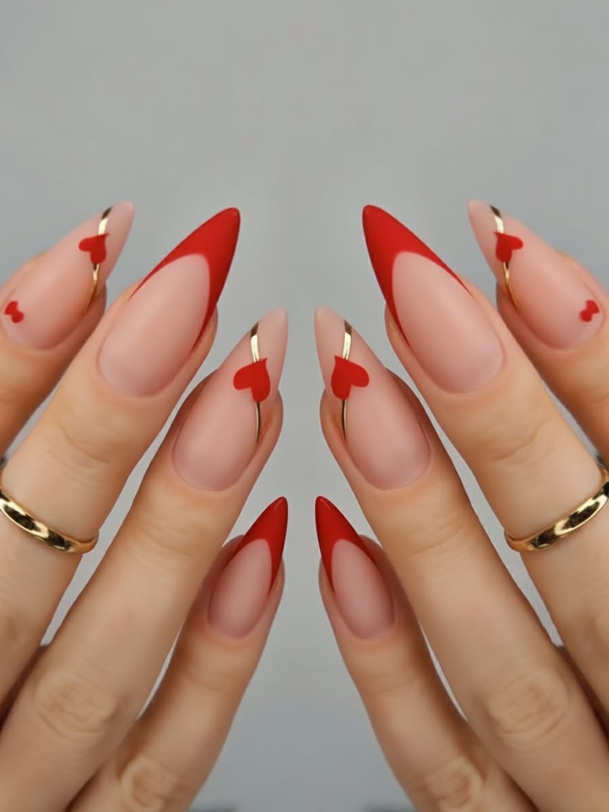 19. Almond French Red Tips With Tiny Heart Details