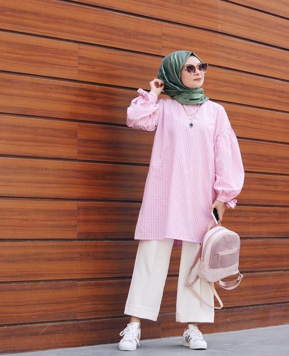 A symphony in pastels, this ensemble features a soft pink checkered tunic over crisp white trousers. It’s a prime example of casual elegance. The outfit is accessorized with a beige backpack and white sneakers, underlining the fashion-forward nature of sneakers outfit with hijab 2024. The hijab in matching pastel green drapes beautifully, creating a cohesive and balanced look.