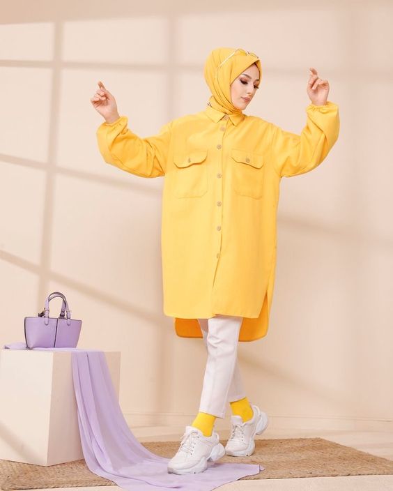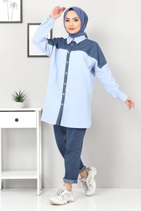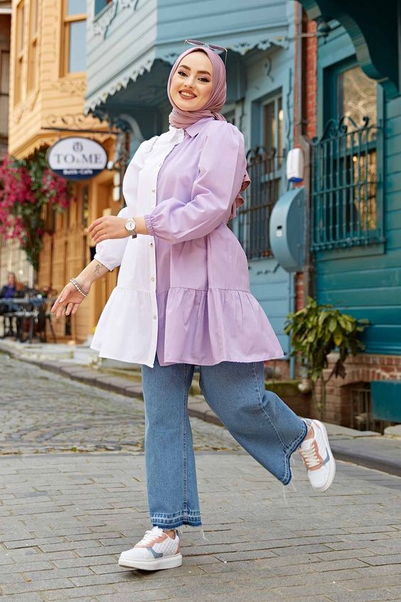 In this image, we see a long white shirt with structured collars and cuffs paired with blue jeans. The outfit speaks to the minimalist who loves a clean, uncomplicated look. The sneakers with hijab outfit here are effortless, yet there’s a hidden depth in its simplicity that’s very 2024.