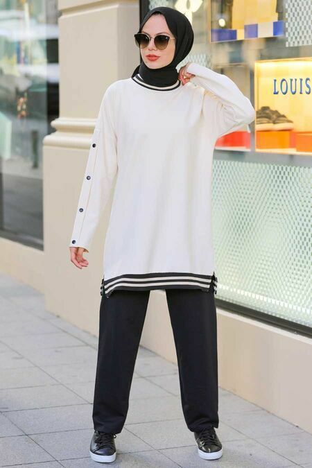 Athleisure finds its way into hijab fashion with this stylish black tracksuit with white striping, asserting that sporty can also mean sophisticated. This outfit breaks down the barriers between sportswear and daywear, allowing for movement and elegance to coexist harmoniously.