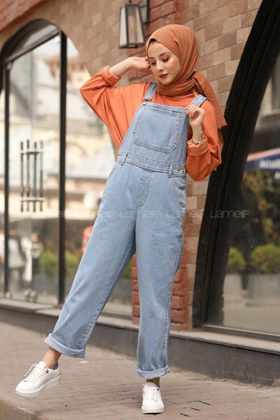 Denim overalls, a timeless piece, are given a fresh twist with a bright orange blouse underneath. The result is a playful yet functional outfit, perfect for a casual day out. White sneakers here are the quintessential choice for an effortless, put-together look that champions casual dress in hijab fashion.