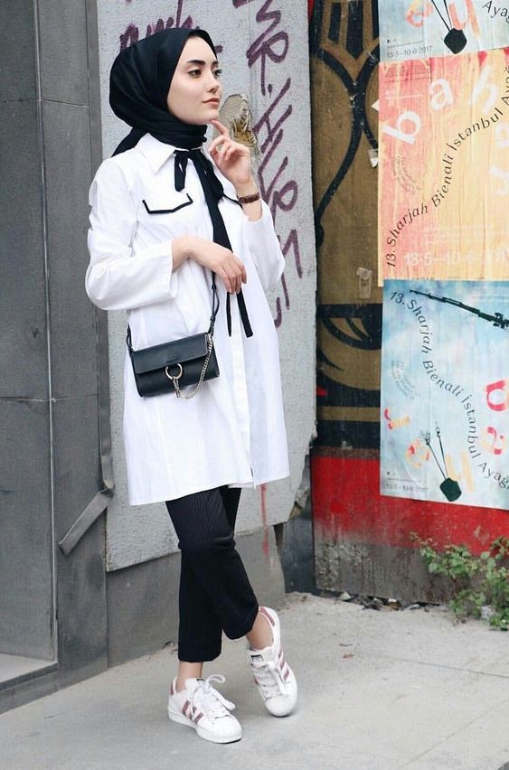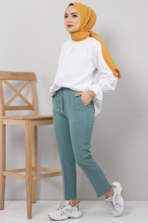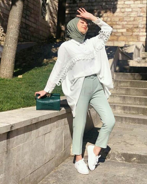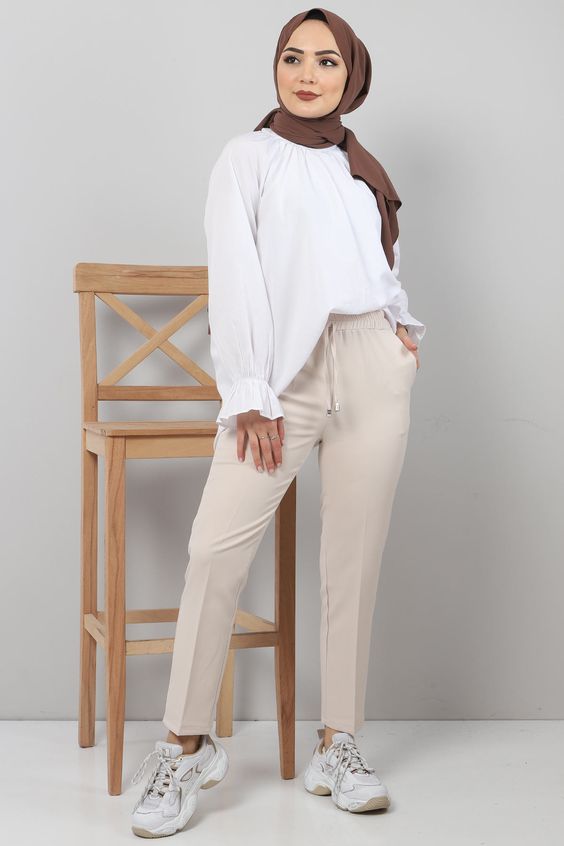 This outfit presents a pristine white balloon-sleeved blouse matched with tapered trousers. The sneakers here are chunkier, embracing the trend of bold footwear that contrasts with delicate Abaya and top pieces. It’s an illustration of balance and modernity in hijab fashion.