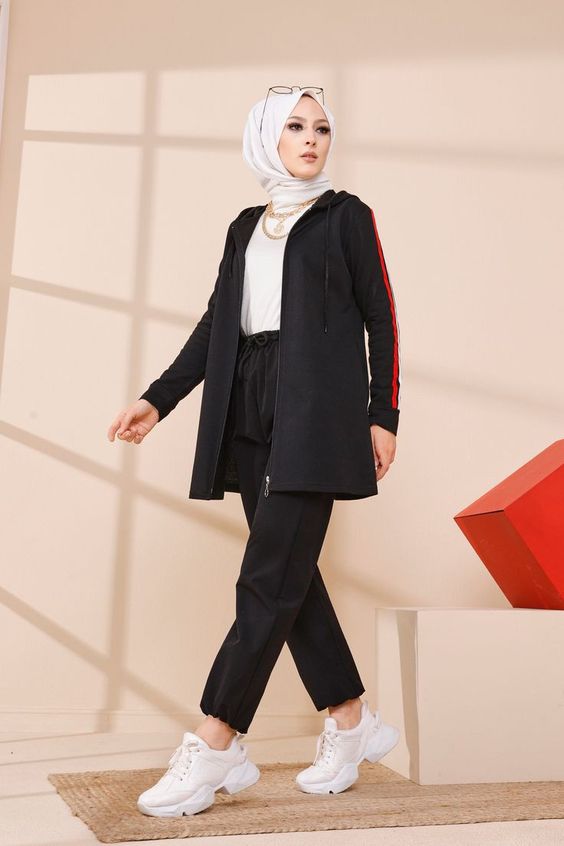 This black ensemble with red accents effortlessly combines the energy of sportswear with the modesty of hijab fashion. The structured design of the coat adds an element of formality, while the sneakers maintain the outfit’s comfort and wearability.