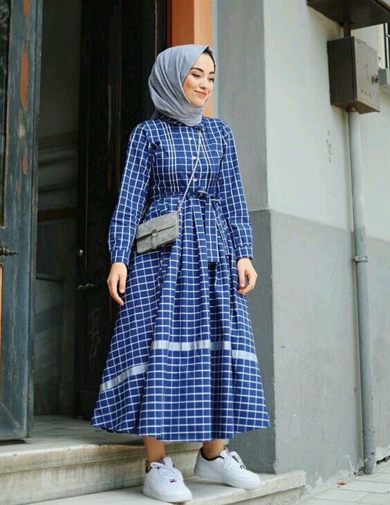 A checkered blue dress with a flared skirt brings a playful yet modest element to the hijab wardrobe. The pairing with white sneakers is a nod to the timeless appeal of dresses with more casual footwear, combining comfort with femininity.