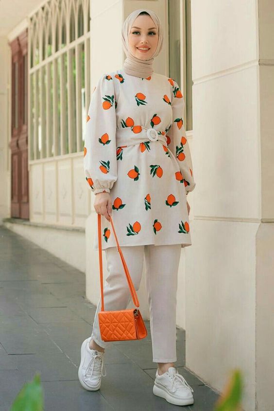 Next up, an outfit that’s as vibrant as it is playful: a white tunic dotted with orange motifs cinched at the waist for a structured silhouette. The Pakai or wearing style here is informal yet chic, with the white sneakers and orange bag adding a zesty punch. This look epitomizes the seamless blend of dress and sporty vibes.