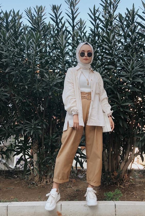 Stripes never go out of style. Here, we have a long striped blazer layered over a high-neck top and camel-colored culottes. It’s a sophisticated take on mixing sneakers with hijab, where the sneakers add a relaxed touch to an otherwise semi-formal outfit. The beige hijab complements the earth tones perfectly.