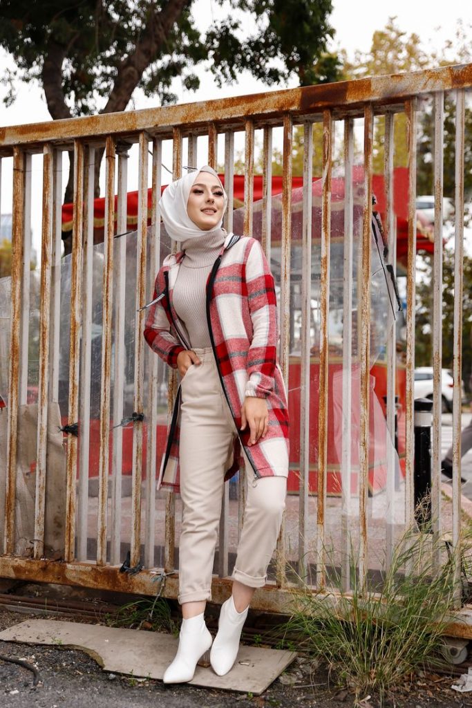 Here’s how you wear checks in 2024. The red and white plaid coat adds a pop of color over a neutral base. Paired with sleek white boots, it’s a chic take on winter wear that respects the hijabi’s need for modest fashion but also allows for some playfulness with patterns.