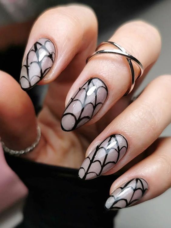 This elegant design features black spider webs intricately painted over a sheer nude base. The combination of delicate web patterns and the glossy finish creates a sophisticated look that’s perfect for those who want to embrace Halloween subtly. This design works well with both short almond and acrylic almond nails, providing a versatile option for various nail shapes.