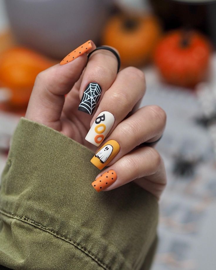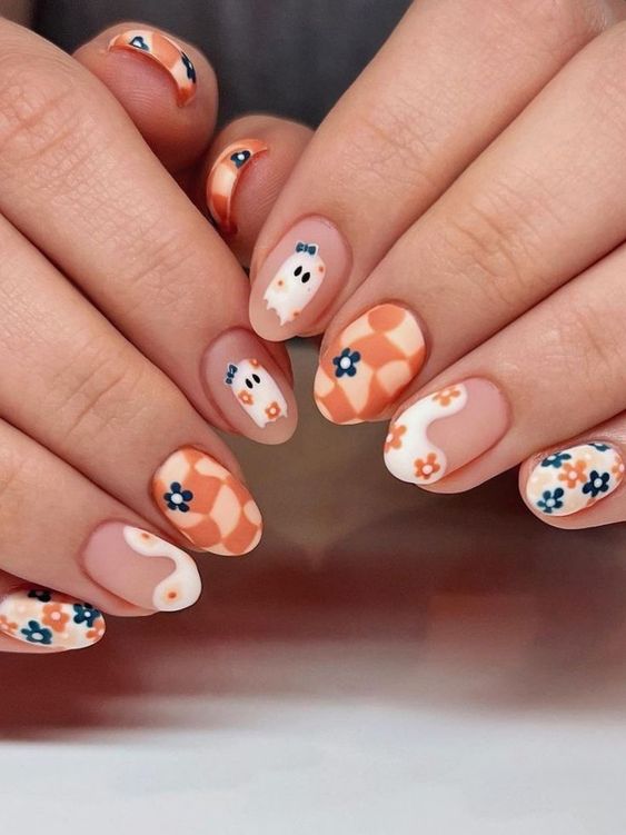 These nails feature adorable ghosts and flowers on a pastel base, blending spooky and sweet elements. The soft colors and cute designs make this set perfect for those who prefer a more lighthearted take on Halloween. This look works wonderfully with short almond and oval nails.