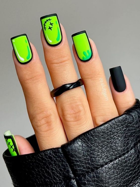 This vibrant green and black nail design pays homage to Frankenstein’s monster, complete with stitch details and a gooey, dripping effect. The neon green is eye-catching, while the black accents add depth and definition. Perfect for short square and acrylic nails, this look is both playful and spooky, ideal for Halloween festivities.