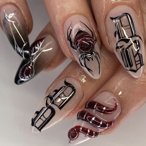 Elegance meets spookiness with this Gothic-inspired nail art. Featuring intricate black designs with deep red accents on a nude base, this set is perfect for those who want a sophisticated yet eerie look. This design is stunning on stiletto and acrylic almond nails, providing a touch of dark romance.