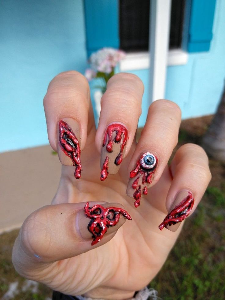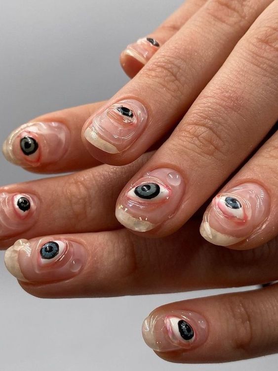 For a truly unsettling and unique look, these nails feature 3D eyeballs on a clear base. The realistic detail of the eyeballs creates a creepy and captivating effect. This design is best suited for short and acrylic nails, offering a bizarre yet fascinating Halloween aesthetic.