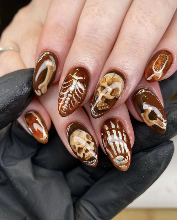 These nails showcase detailed fossil designs, including skeletons and bones, over a rich brown base. The earthy tones and intricate artwork give a sense of ancient mystery, perfect for a Halloween-inspired look. This design works wonderfully with almond and acrylic almond nails, adding a touch of prehistoric charm to your style.