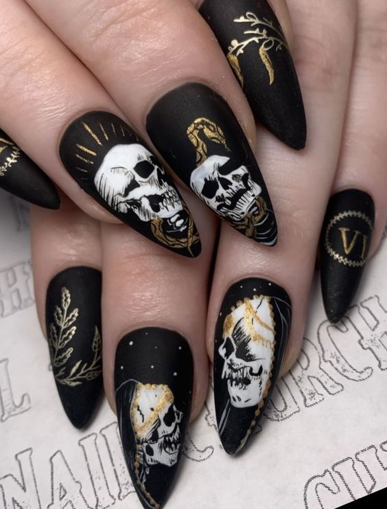 Featuring matte black nails with golden accents and white skulls, this design exudes elegance and darkness. The matte finish adds a sophisticated touch, while the skulls and gold elements provide a spooky yet classy vibe. Ideal for stiletto and acrylic nails, this look is perfect for those who love a luxurious Halloween style.