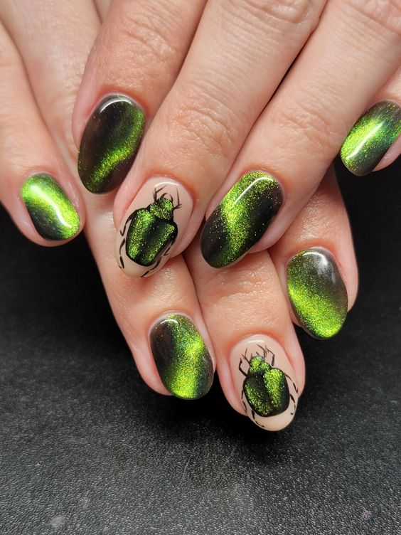 Embrace the creepy-crawly theme with these nails featuring shimmering green beetles. The metallic finish adds a magical touch, while the beetle designs bring in the spooky factor. This look is perfect for oval and acrylic nails, offering a blend of elegance and eeriness.