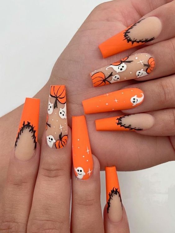 Bright and bold, this nail art set is all about celebrating the quintessential symbols of Halloween: pumpkins and ghosts. The vibrant orange base makes the designs pop, while the detailed artwork adds a fun and whimsical touch. This look is ideal for those who love short coffin and acrylic nails, offering a playful yet stylish way to get into the spooky season.