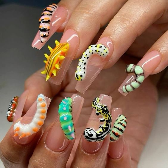These nails take 3D art to the next level with colorful, detailed caterpillars crawling over a clear base. The realistic design and bright colors make for a fun and spooky Halloween look. This design is ideal for acrylic and coffin nails, adding a whimsical yet creepy touch to your style.
