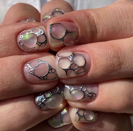 These nails feature a unique and eerie bubble effect with a metallic silver outline. The translucent bubbles give a ghostly, otherworldly appearance, perfect for adding a subtle yet spooky touch to your Halloween look. This design is ideal for short and acrylic nails, offering a creative and hauntingly beautiful option.