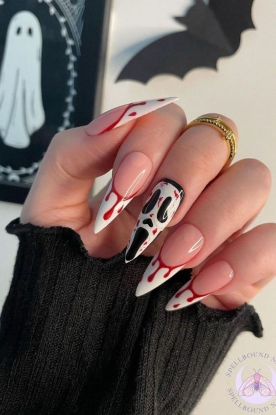 Inspired by the iconic horror movie “Scream,” these nails showcase the famous Ghostface mask with dripping blood details on a nude base. The dramatic and recognizable design makes a bold statement, perfect for Halloween. Best suited for stiletto and acrylic nails, this look is both terrifying and stylish, ensuring you stand out at any spooky event.
