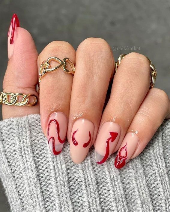 For a fierce and fiery look, these nails feature striking red flames over a nude base. The design is both simple and dramatic, making it a great choice for anyone looking to make a bold statement. This style is particularly stunning on stiletto and almond nails, adding a touch of heat to your Halloween ensemble.