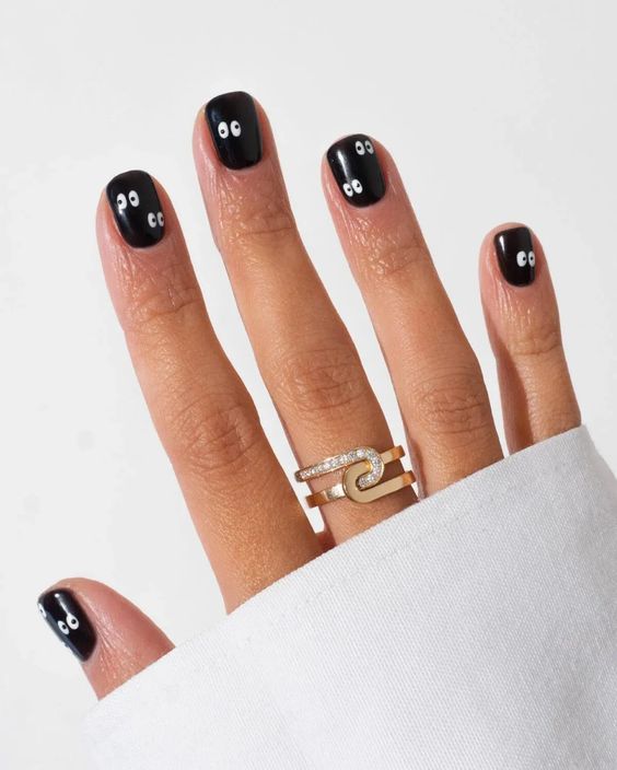 These cute yet eerie nails are perfect for Halloween with their black base and tiny white eyes peeking out. The simplicity of the design makes it easy to recreate, while still delivering a spooky effect. This design is especially suited for short square and oval nails, offering a minimalist yet festive look.
