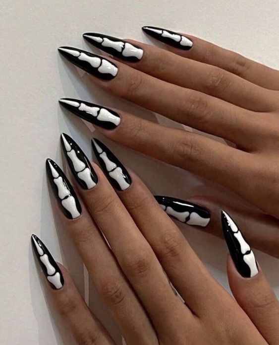Embrace the eerie with these black and white bone nails. The stark contrast between the colors creates a striking and spooky effect, perfect for Halloween. This design looks particularly dramatic on stiletto and coffin nails, making it a standout choice for the season.